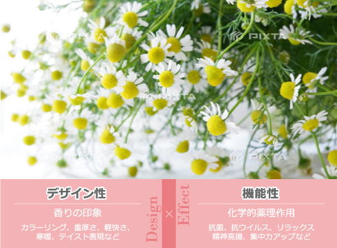 香りといっても、ただ「いい香り」というだけではありません。 100%天然植物から抽出した香りには、その植物そのものの持つ力が薬理効果として機能します。色味の表現や、暖かな雰囲気、クールな感じなど、「香り」から感じられる印象を使った、空間全体からのブランディング効果(デザイン性)に加え、空気清浄やウイルス対策、集中力アップや高揚感アップなどの薬理効果(機能性)も付加して、ココロとカラダ、環境に働きかける機能的な空間をつくります。